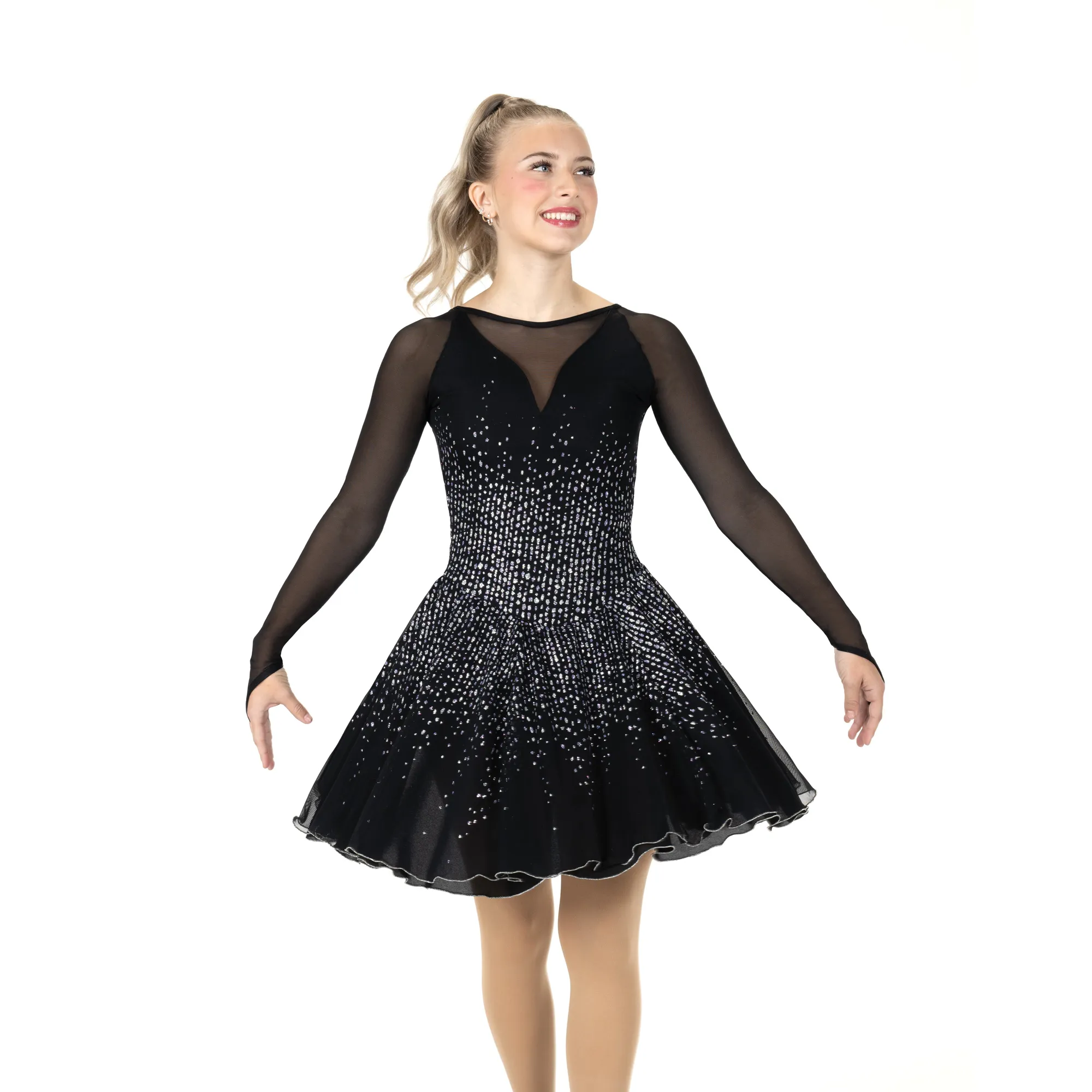 Stunning hourglass glitter mesh dress with a fit-and-flare silhouette, long mesh sleeves, a dropped locket style back keyhole with a crystal cluster accent and double layer skirt.