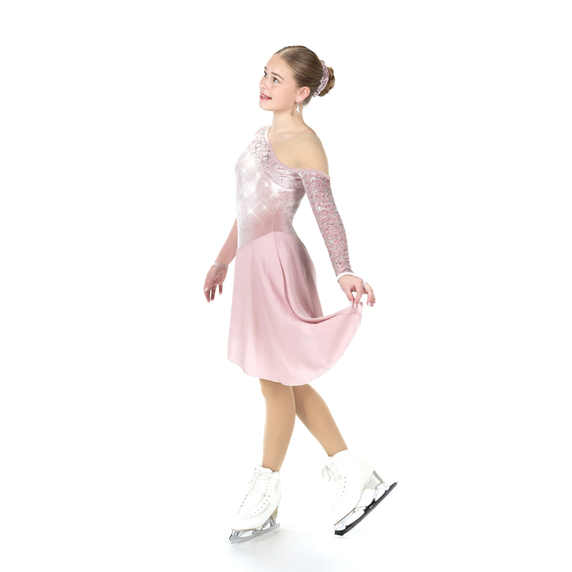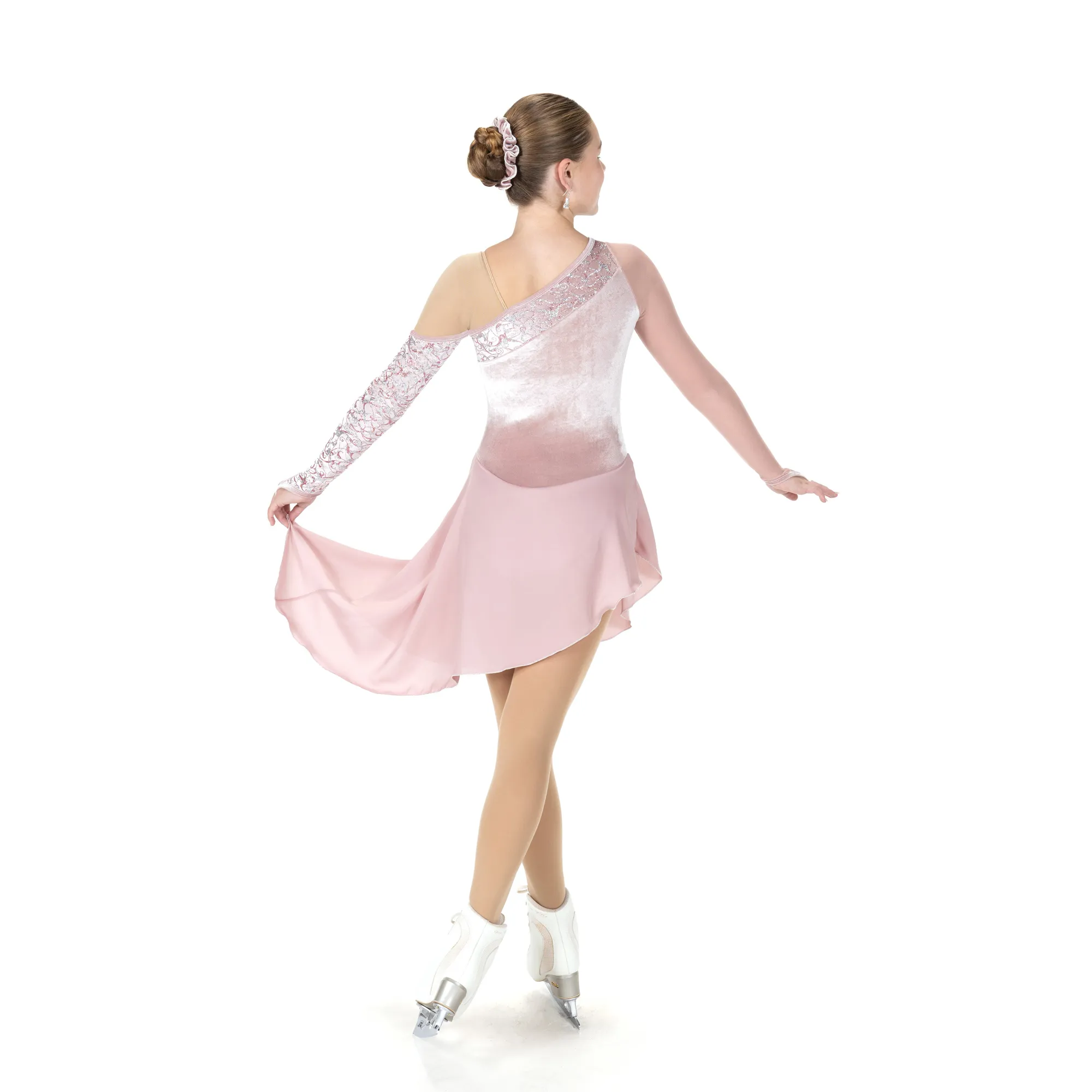 An elegant velvet dress with an angled neckline and matching slanted georgette skirt. The neckline is trimmed with glitter that continues into one sleeve and is accented bysparkling crystals along the front.The opposite sleeve is sewn in sheer mesh and finished with finger points. Lined.