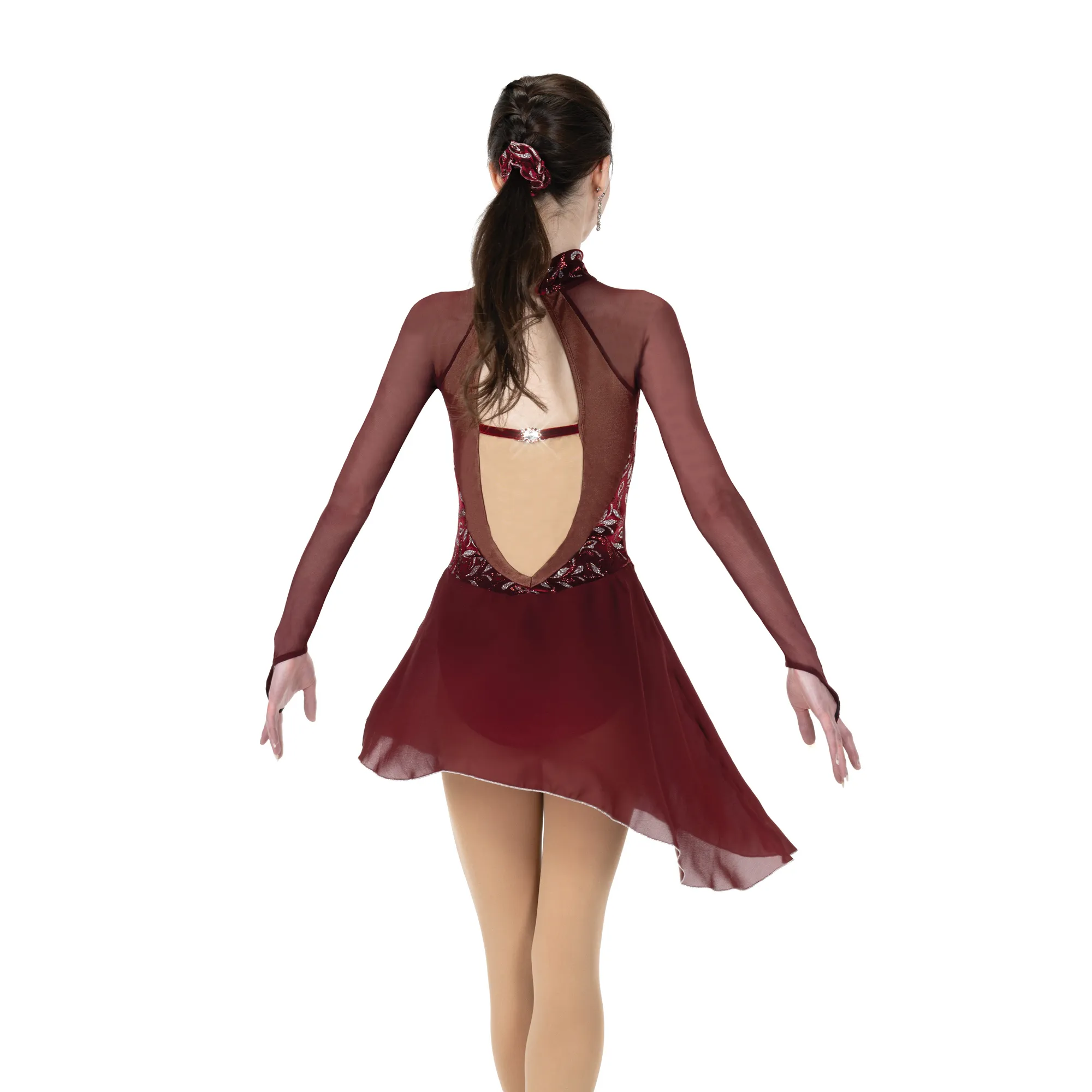 Rich red-wine glitter velvet dress with long garnet mesh sleeves cut in an hourglass shape at the front and wrapping around the back illusion style keyhole and shifting slightly forward at the sides for a slimming effect. The faux back strap features a large crystal highlight and the longer georgette skirt is angled to one side and edged in silver. Mesh back and sides are fully lined for coverage.