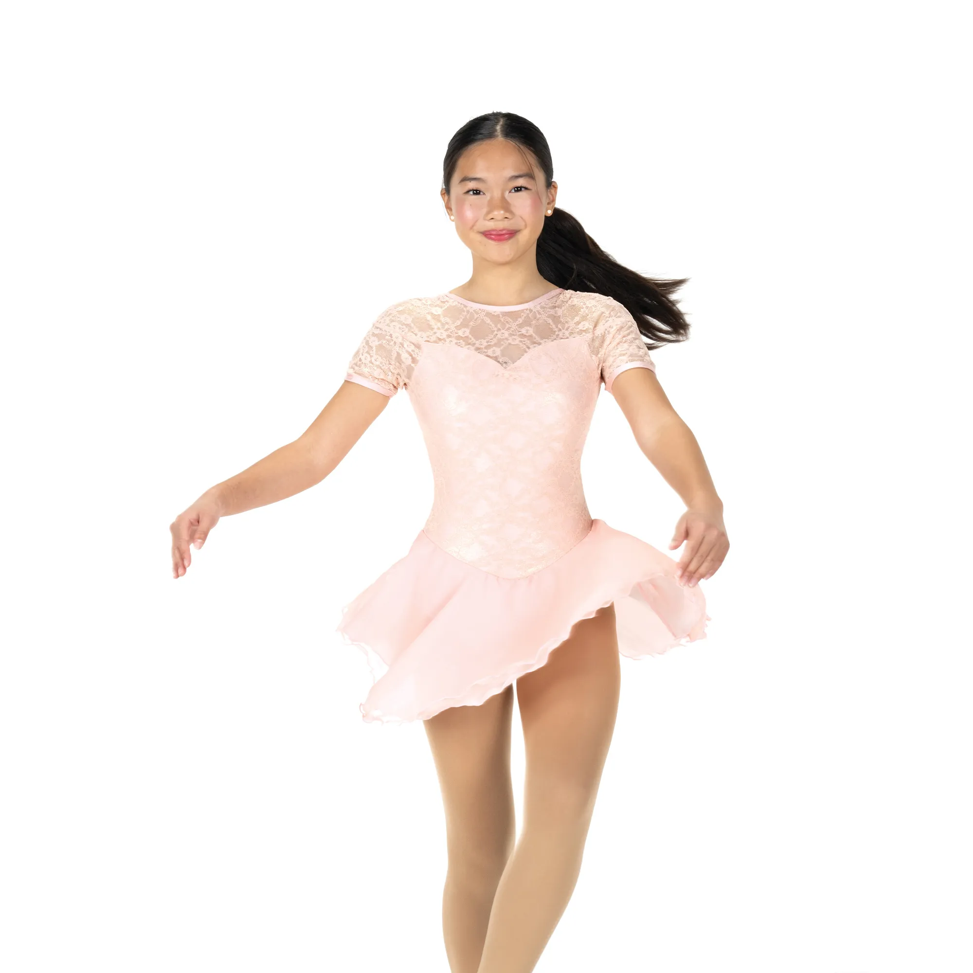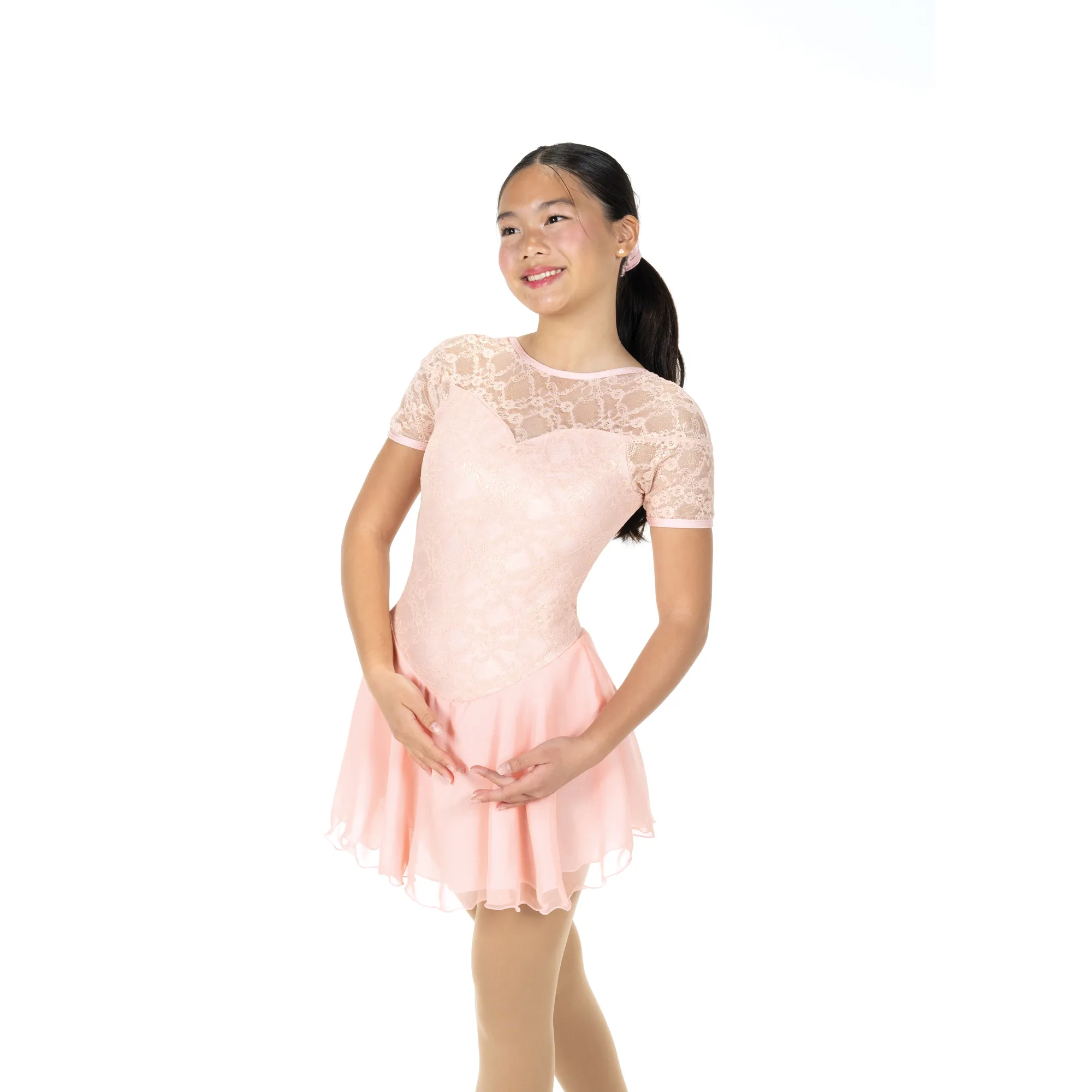 This soft apricot-pink dress is sewn in a delicate gold embossed lace with a sweetheart front, dainty cap sleeves and features a pair of crossed spaghetti straps for a secure fit at the open, shaped back. Matching double layer skirt; fully lined in lycra.