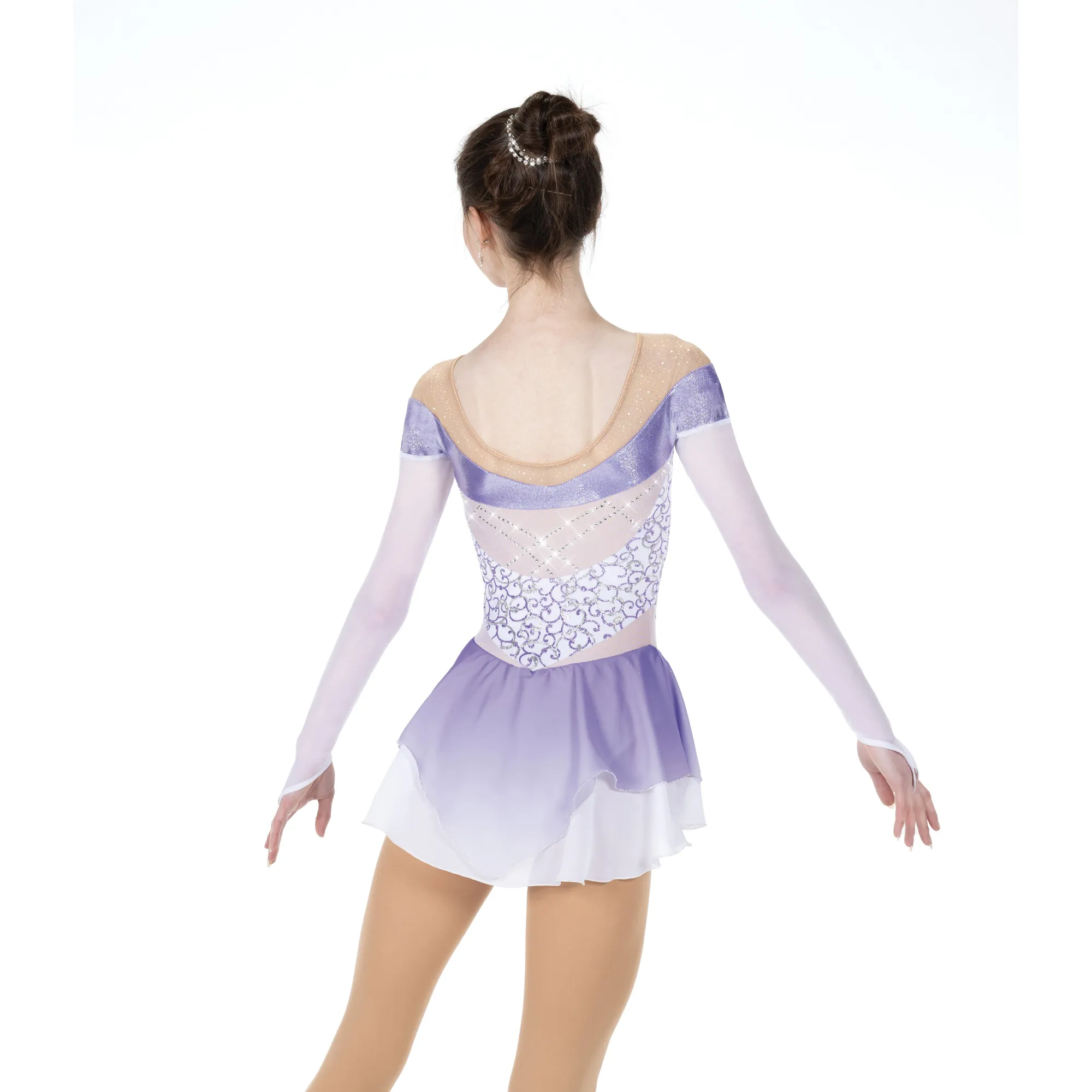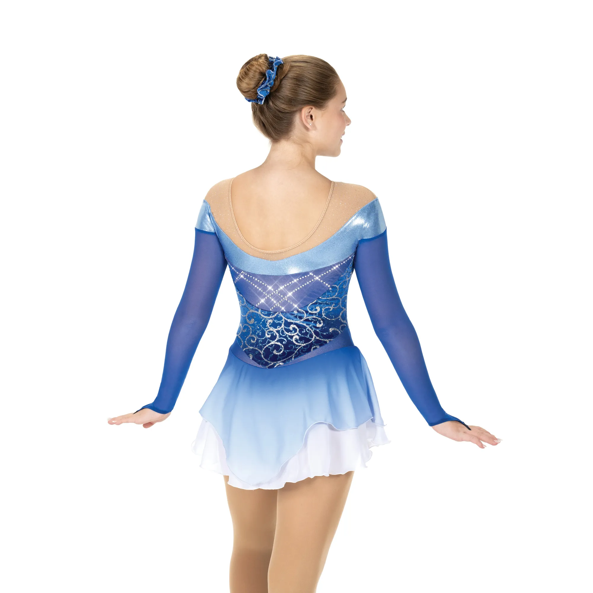 Shimmery hologram trim sweeps along the sweetheart neckline and along the off-the- shoulder cut of this glitter velvet design. The mesh back insert is accented by crossed strands of sparkling crystals and the top skirt is dip-dyed and drops into a demi-tulip hem at the back. Lined.