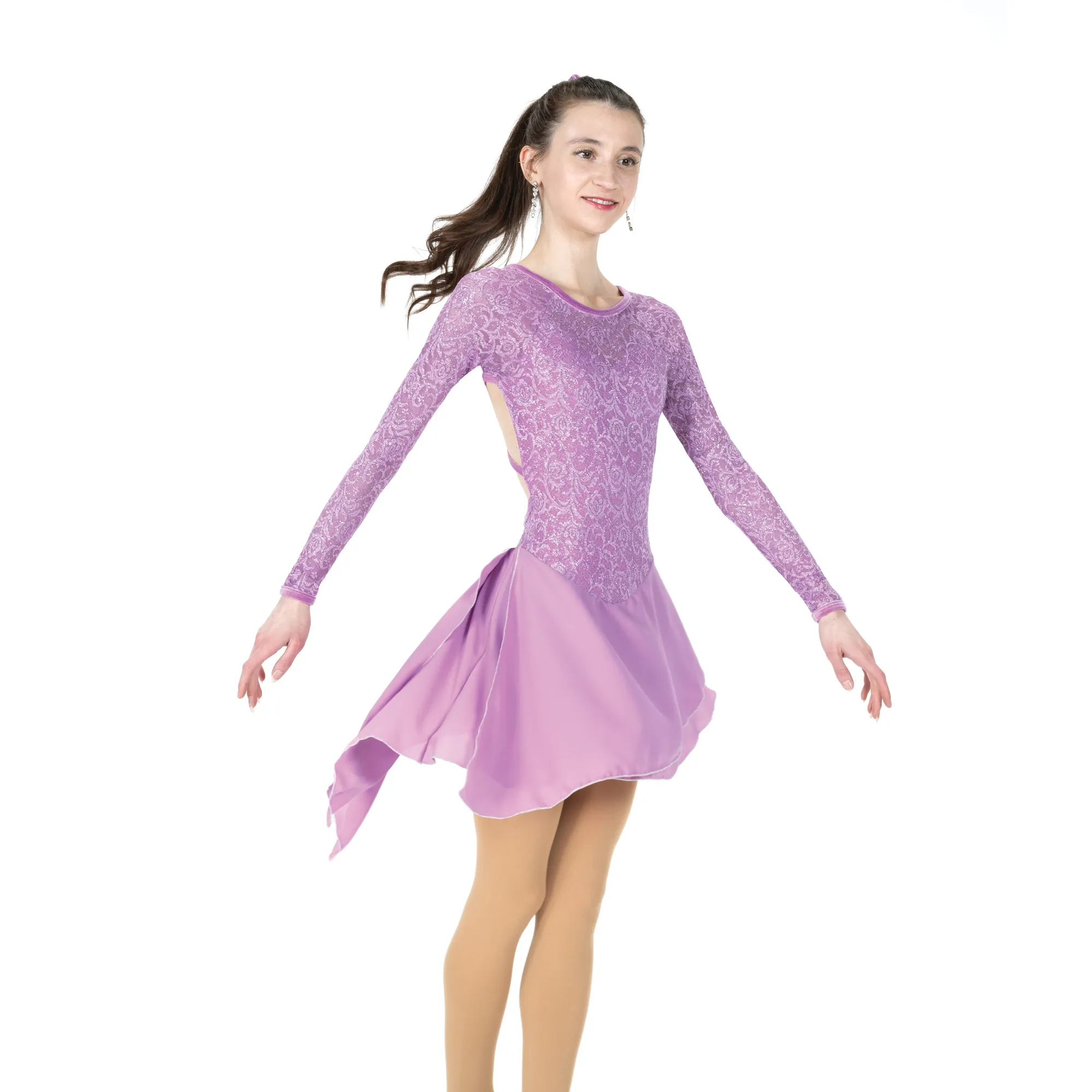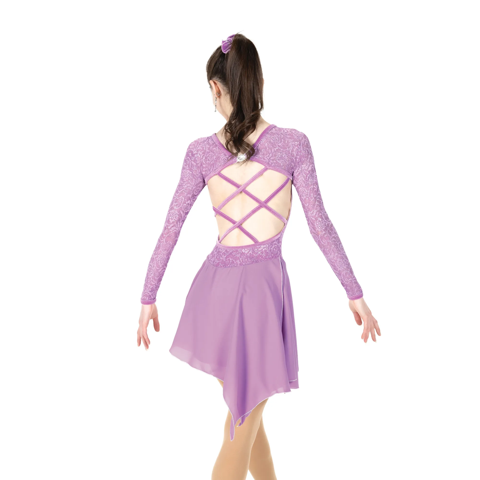 Lovely petal purple glitter lace dress with long sleeves, an open lattice back, a double layer georgette skirt with an asymmetrical hem and a sparkling cabochon crystal accent at the back. Lined.
