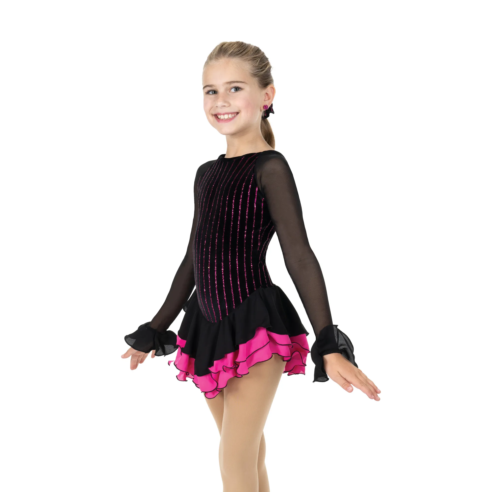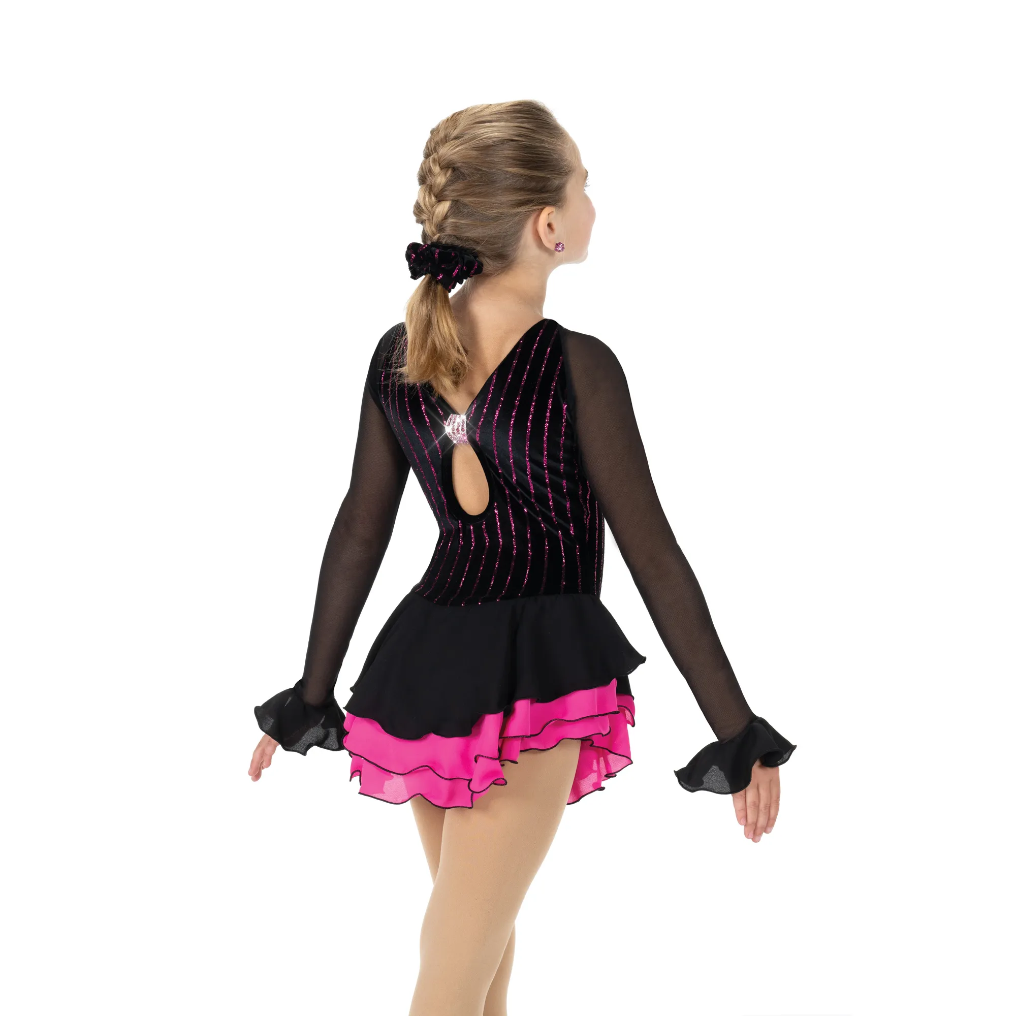 Classy pink glitter pinstripes on a black velvet background with long mesh sleeves, a dropped locket style back and a triple layer skirt edged in black.