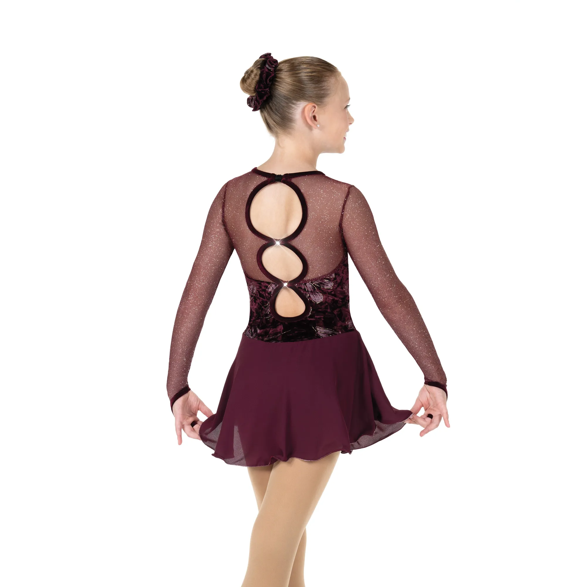 A dark wine dress in crushed velvet with embossed floral imprints outlined in drizzles of iridescent glitter. Sweetheart shaping at the front and a trio of keyholes descending down the back add flair. A slightly longer georgette skirt and long shimmer mesh sleeves withfinger points tie it all together.