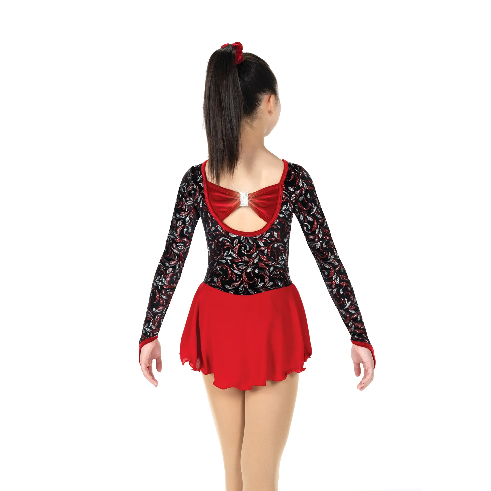 Jet black velvet dress with swirls of silver and jewel toned glitter set off by contrasting georgette skirts, jewel toned trim and a back bow detail with a crystal cluster accent at the center.