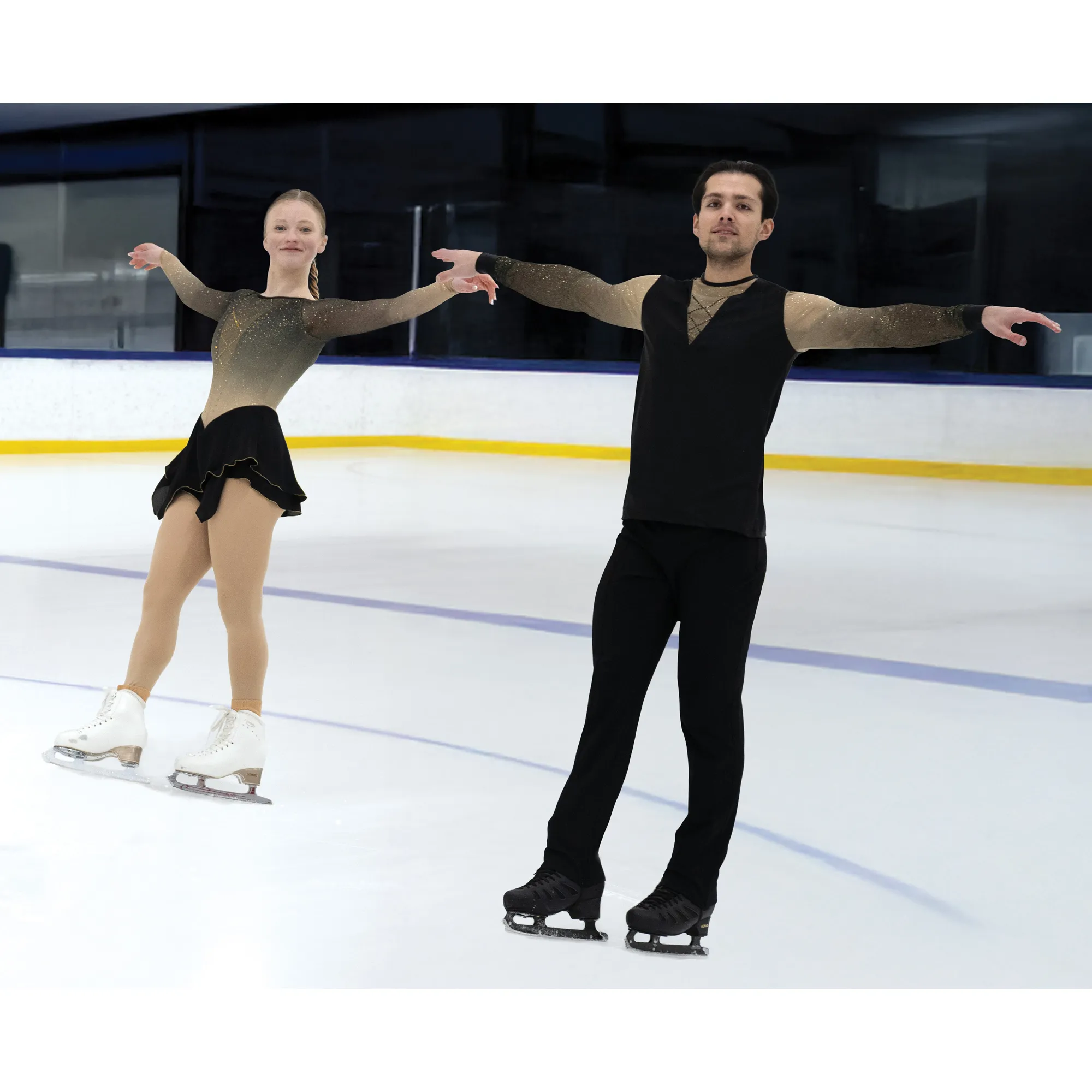 Gold shimmer mesh dress that shades to night black at the shoulders and features a V-back with a pair of spaghetti straps accented by a circle of gold crystals. The V-front is fully lined for coverage and highlighted by gold crystals that repeat the shape of the crossed back. The layered georgette skirt is edged in gold. Body is lined in lycra.