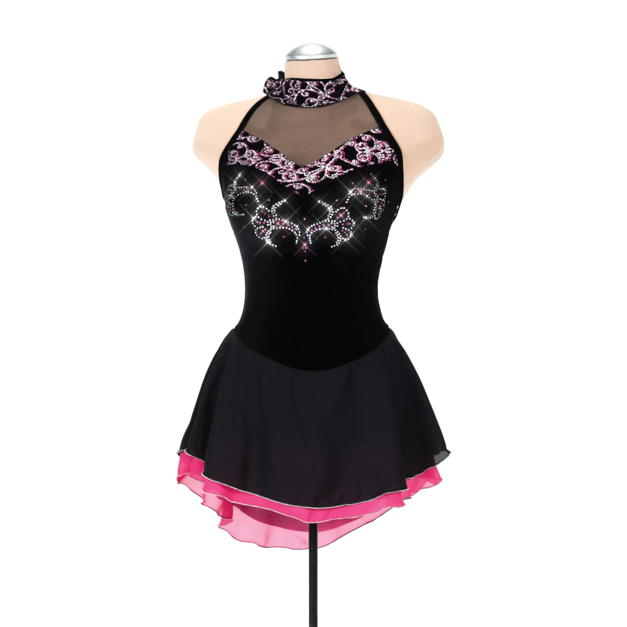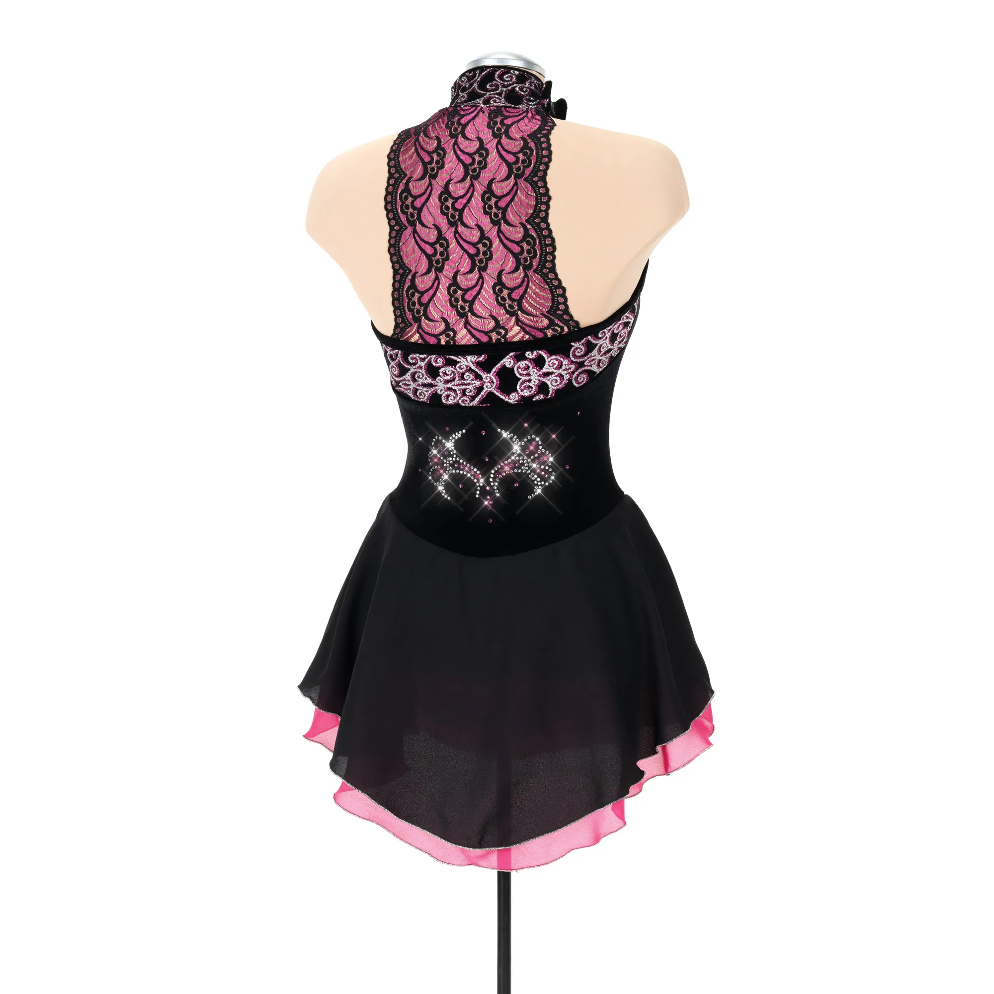 A sumptuous black velvet dress with a mesh sweetheart neckline outlined in glittery swirls and accented by a spray of pink and silver crystals. The back features a matching scalloped lace panel and the double layer georgette skirt is edged in silver.