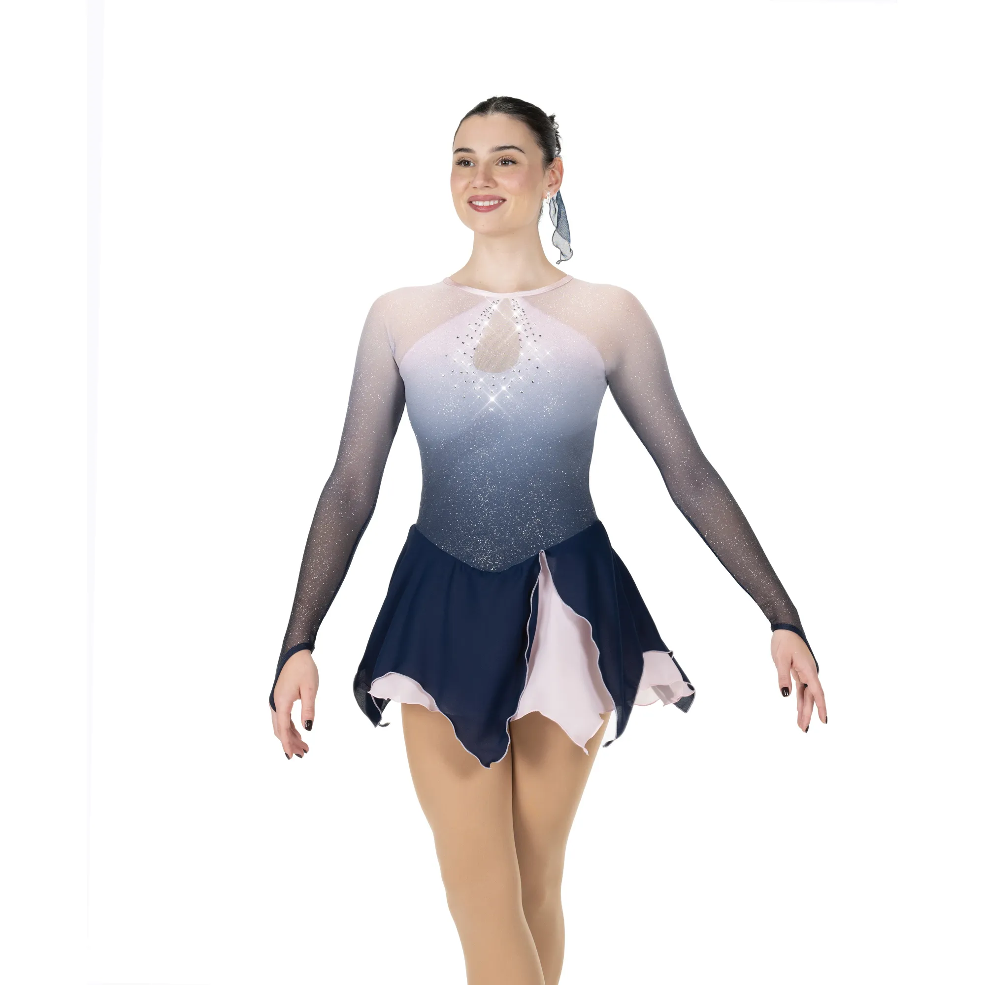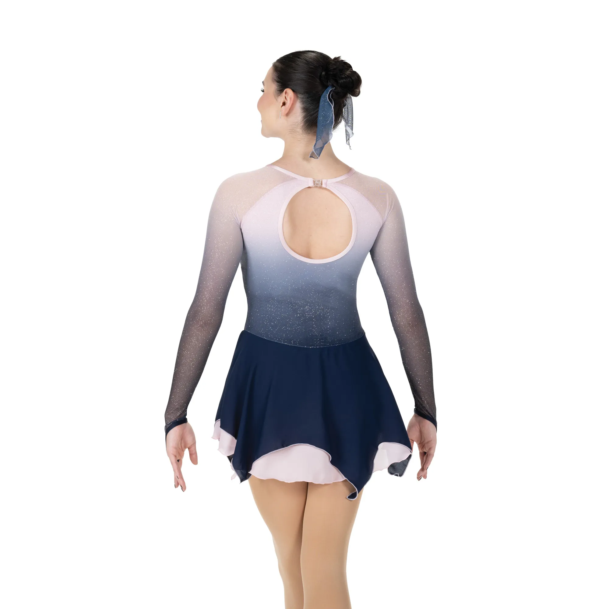 A soft dawn pink glitter mesh dress that shades to a deep evening blue at the waist. The front features an illusion style keyhole (fully lined in beige lycra) under the mesh overlay, outlined with sparkly crystals. Double layer georgette skirt with silver edging adds flow and movement. Lined.
