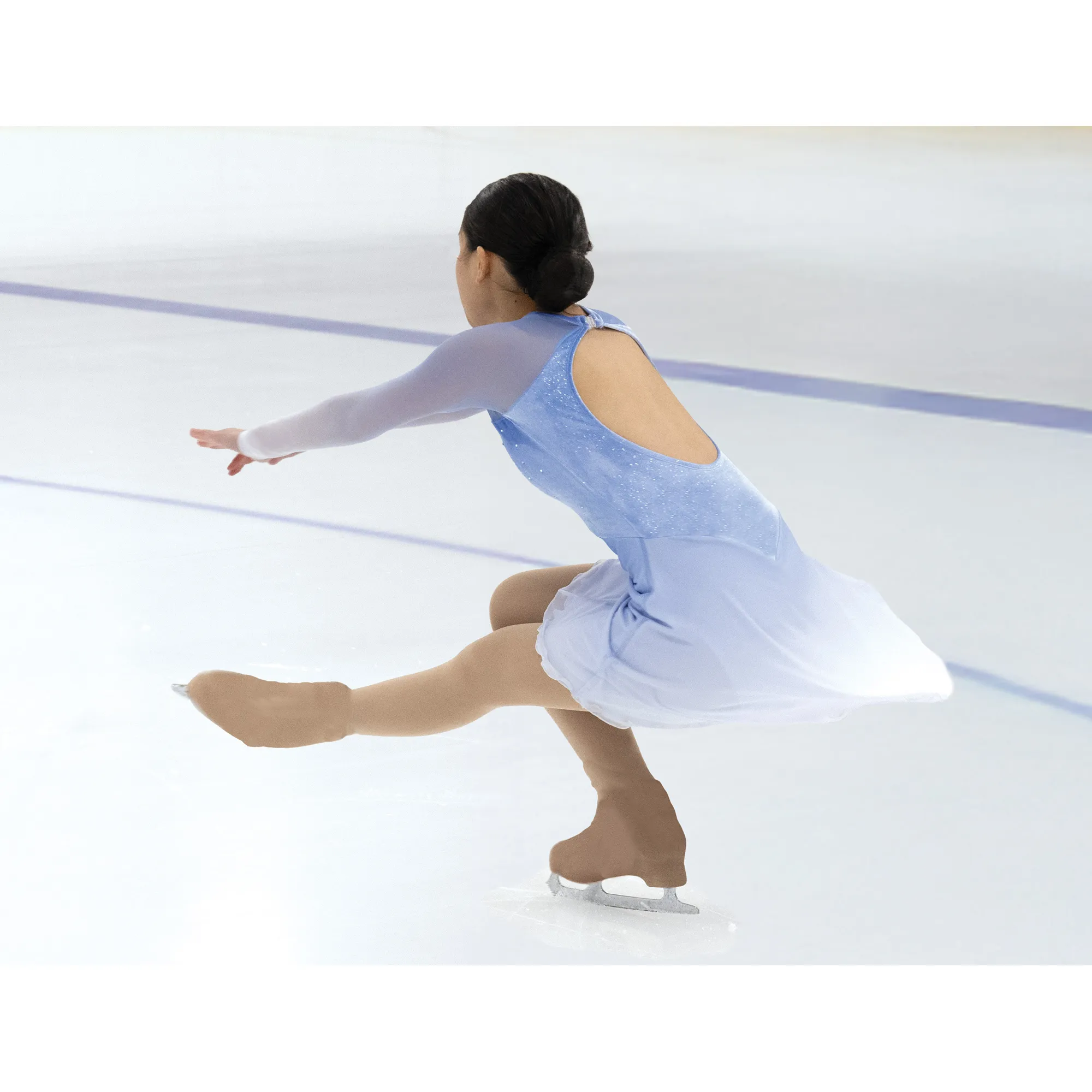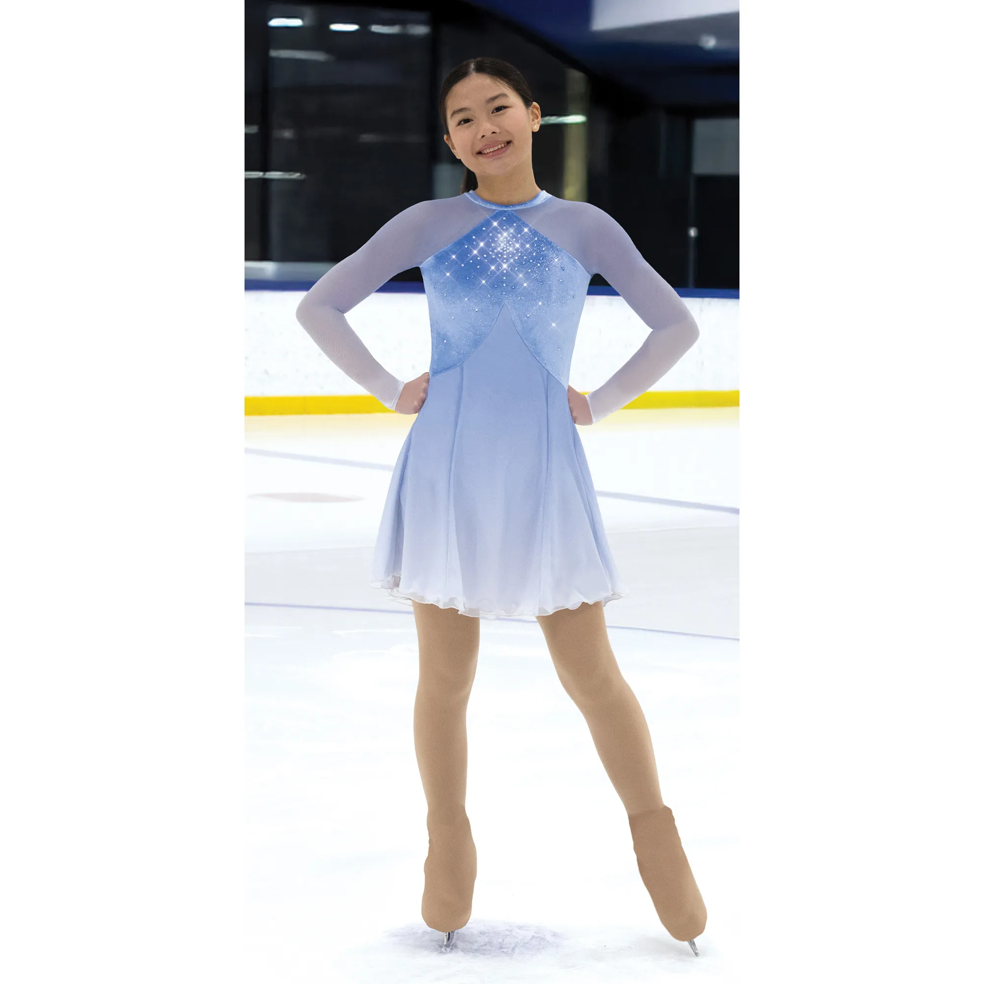 This dress is cut in a flattering empire front that dips lower at the back into a traditional skirt line. The mesh skirt fades into a soft white at the hem to match the sleeves and a classic keyhole back and glittering crystals at the front add delicate finesse.