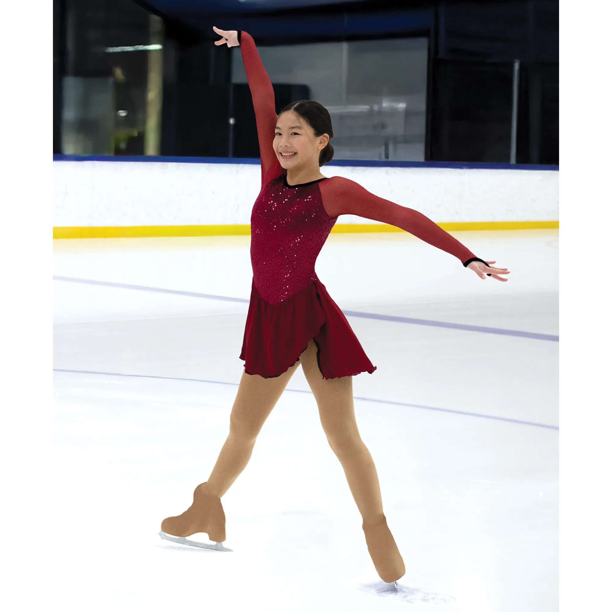 This sequin velvet style in a rich, deep cherry-wine shade catches the light with every movement. The double layer georgette skirt features a black underskirt and the black binding at the wrists, around the neck and in the back crossover straps adds definition and a hint of mystery.