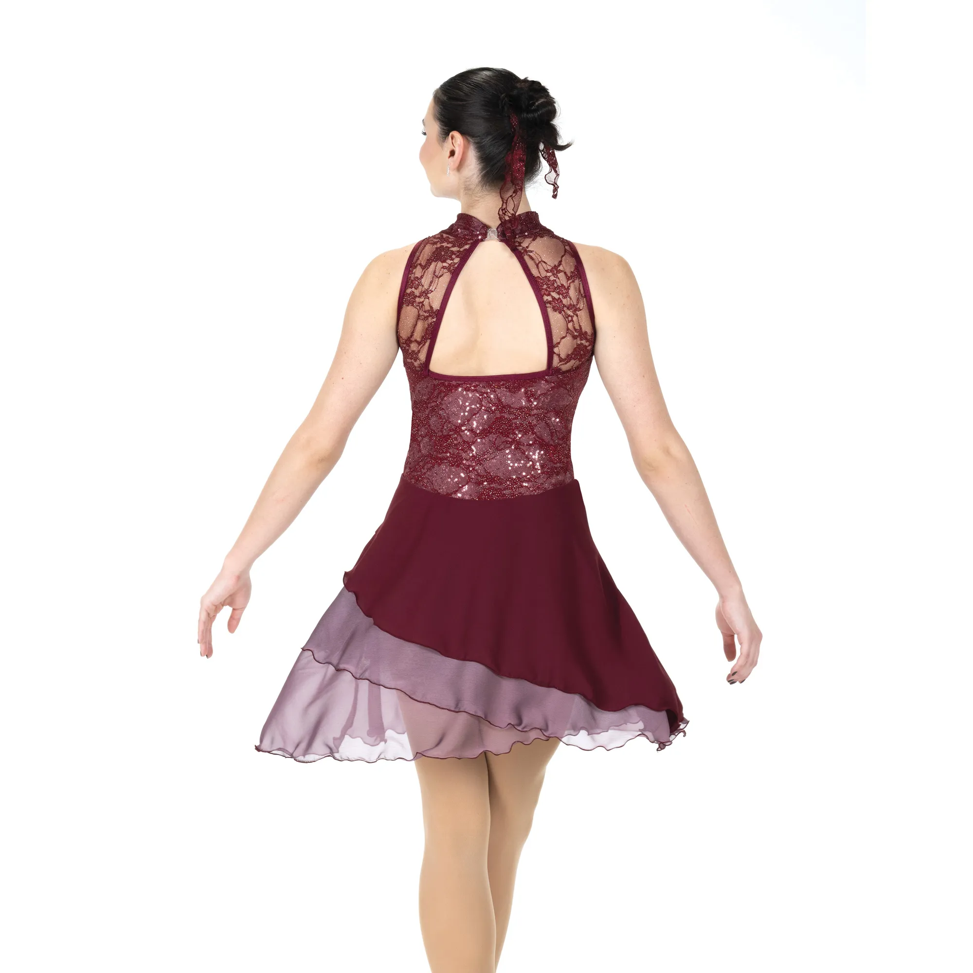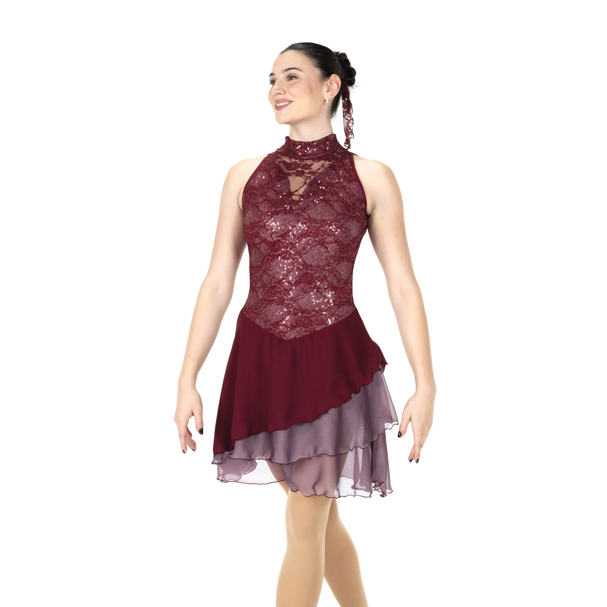 Rosy-mauve sequins add shimmer and shine to this wine coloured lace dress. Sweetheart shaping at the front, a moderate back keyhole and a triple layer skirt of georgette over rosy-mauve linen chiffon add elegant touches. Lined.