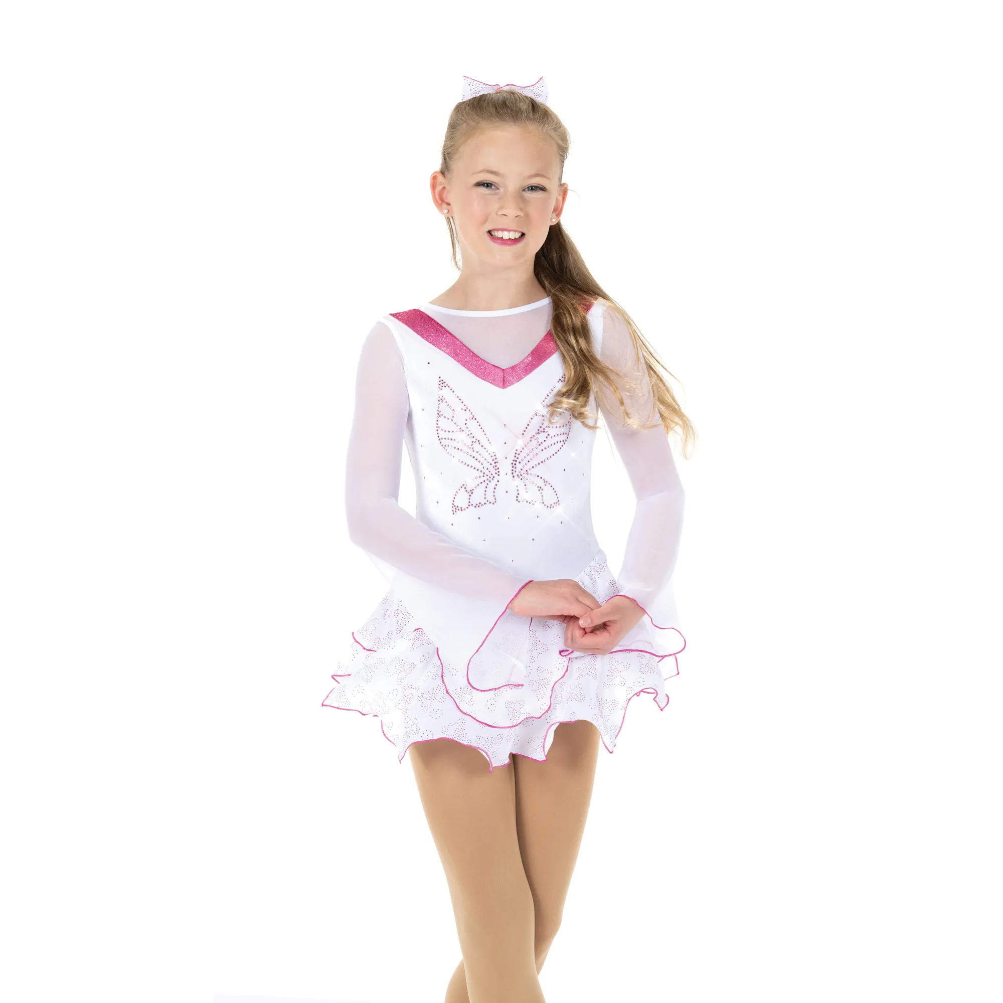 Snow white velvet dress with fluted mesh sleeves, a V-neck trimmed in pink shimmer velvet and a pink crystal butterfly motif that is picked up in the double layer skirt of glittery pink butterfly georgette. A sequined butterfly dresses up the back and pink skirt edging adds finesse. Lined.