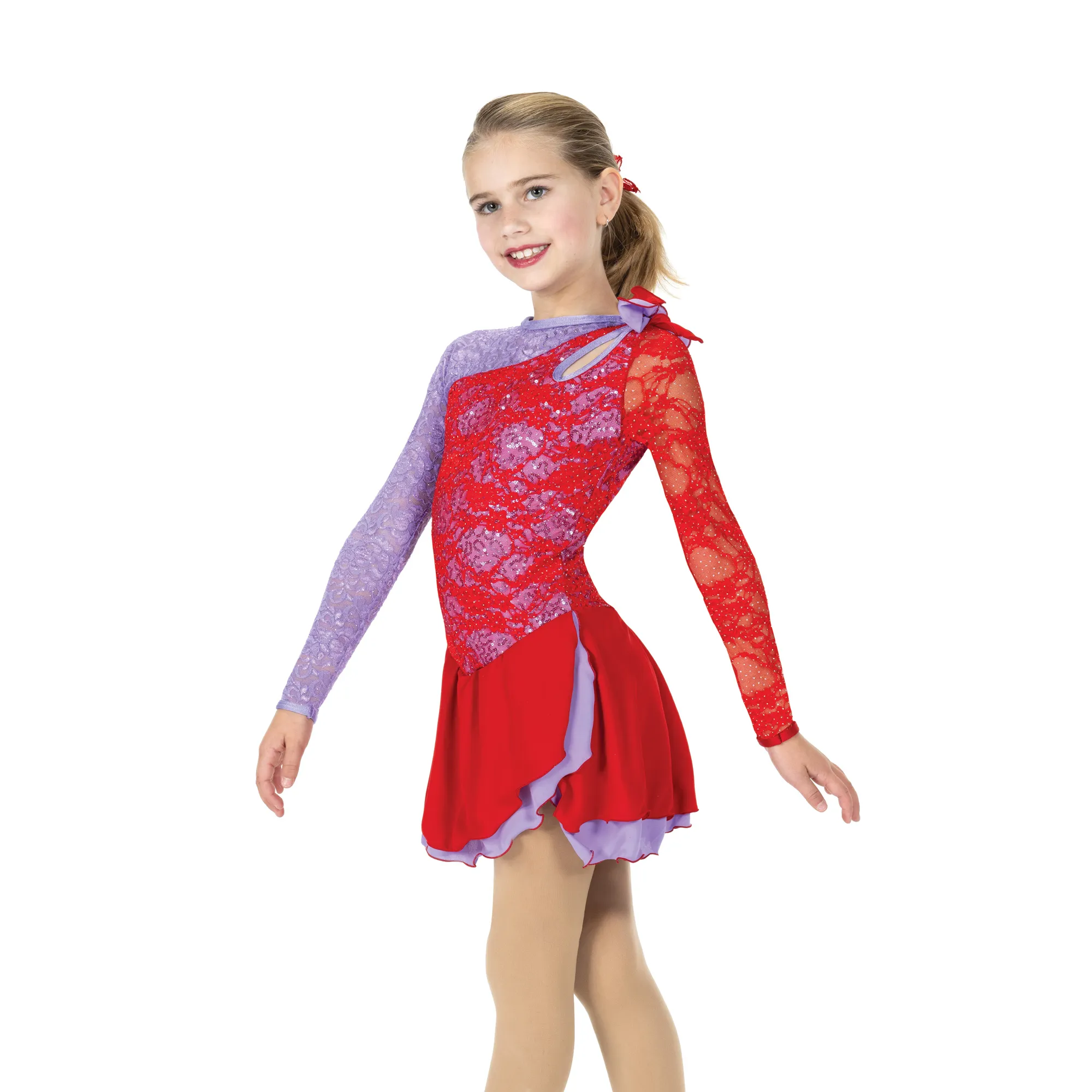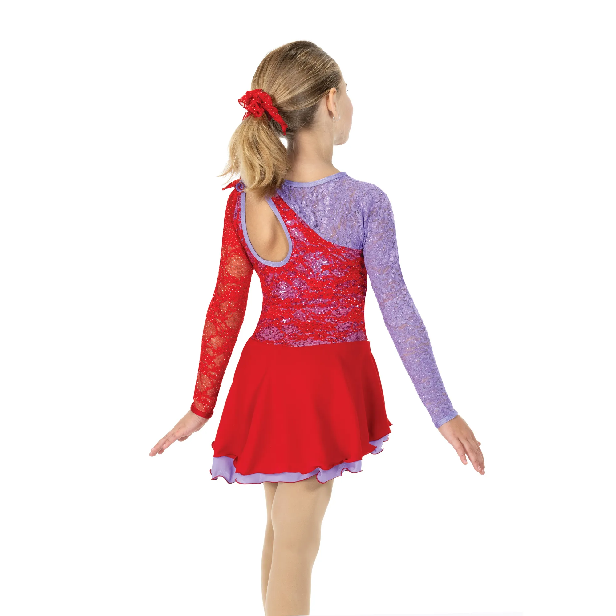 Roses are red, violets are blue, skating is sweet and this dress is too! A lively colour combination in glittery lace with a sparkly sequin lining, asymmetrical styling, georgette ribbon bow at the shoulder, plus a double layer overlapping georgette skirt. Lined.